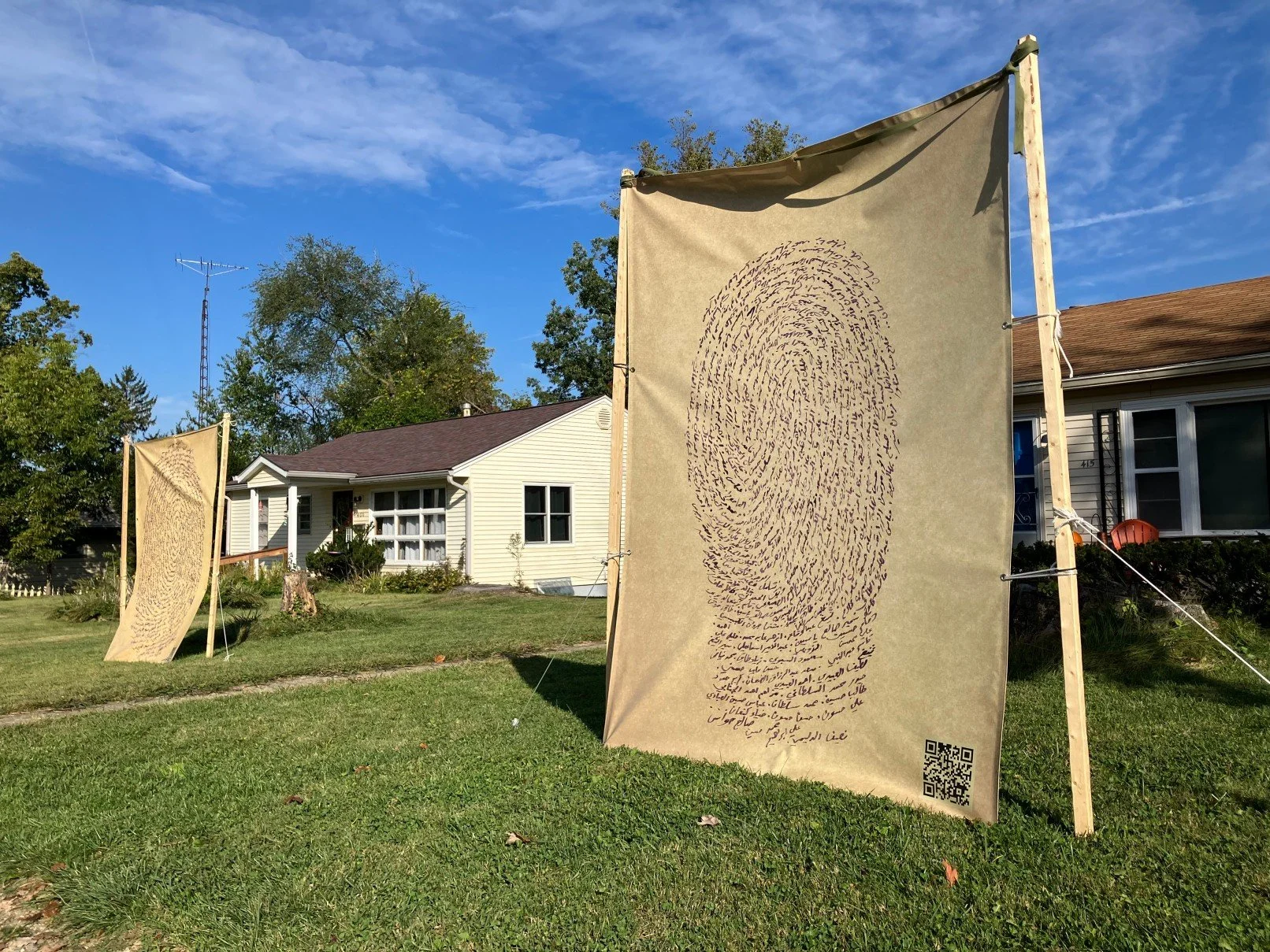 Manufactured Democracy is an art installation with more than 20 lightboxes, each 24 x 24 inches. On each lightbox, a piece of paper covers the light. In the shape of a Fingerprint, with an average size of 16 x 8 inches, I handwrite in Arabic calligraphy the names of Iraqi individuals who lost their lives in civil wars in Iraq since 2003. The work on paper, placed on lightboxes, is highlighted by the light reflected through fingerprint calligraphy. Fingerprints are references to Iraqi elections where voters dip their index finger in purple Ink after voting.