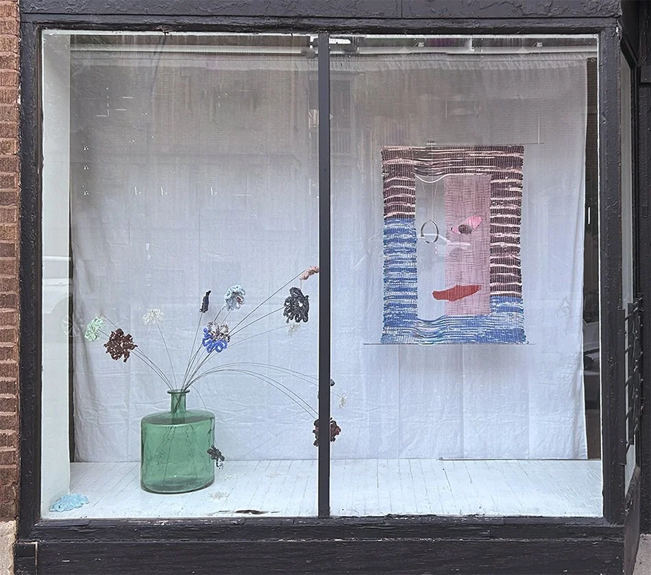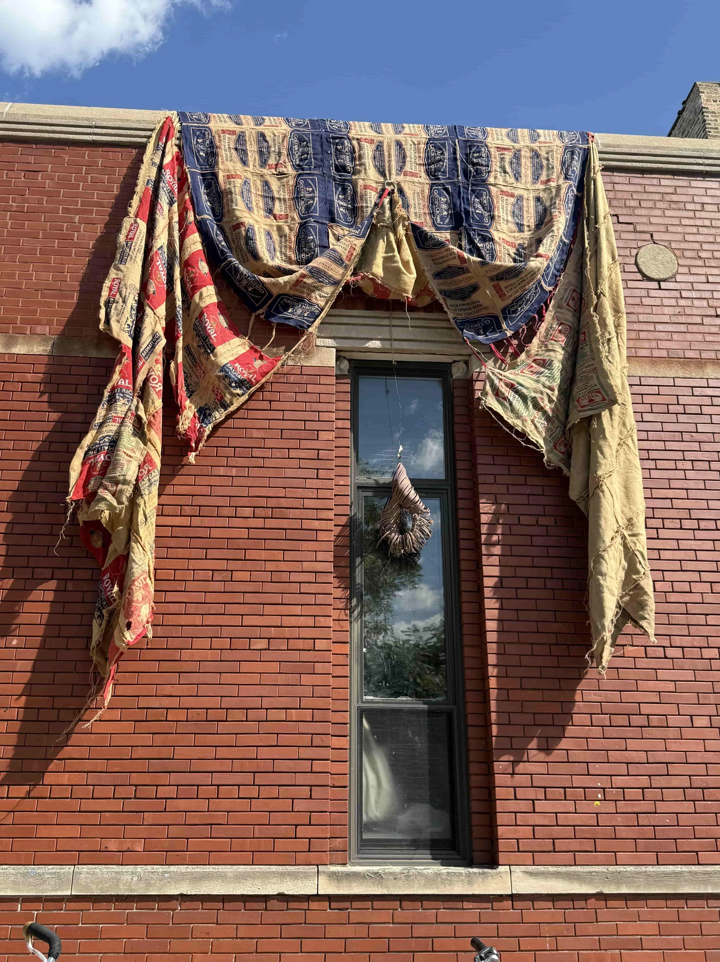 Made of flattened aluminum cans from the streets of Chicago and used single-use plastic bags, “A Banner From the Abandoned” continues Jerry Bleem’s interest in detritus. Responding to the 2025 Terrain Biennial’s theme of DIY, Bleem approached the pastor of St. Peter Church in downtown Chicago to propose a festive hanging above the church’s doors. Will the time spent cutting hundreds of plastic bags into lines, crocheting them into a surface and embellishing them with giant street sequins make us more mindful of our trash? Bleem keeps hoping and thanks all who helped gather bags for this project!