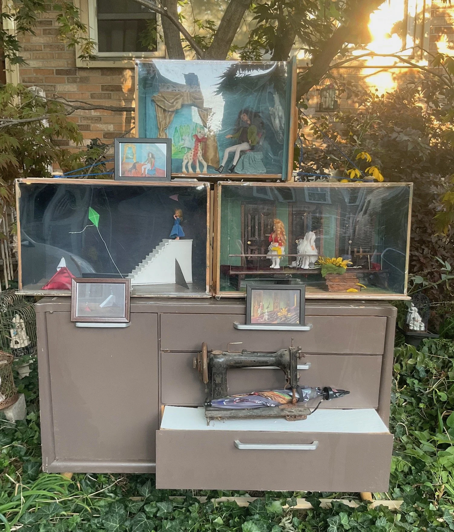 2024 marked the 100th anniversary of Surrealism. I've chosen 3 paintings to reinterpret in assemblage: Leanora Carrington, Self Portrait; Gertrude Abercrombie, Between Two Camps; Dorothea Tanning, Eine Kleine Nachtmusik. These are not exact reproductions. I used the skills I possess and whatever bits and pieces washed up on my shore from thrift stores, alleyways, and basements. In the gaps between my work and theirs lies the mystery and amusement, in the spirit of Surrealism: "the chance meeting of an umbrella and a sewing machine on a dissecting table"--per the "Compte de Lautreamont," whose poetry anticipated Surrealism.