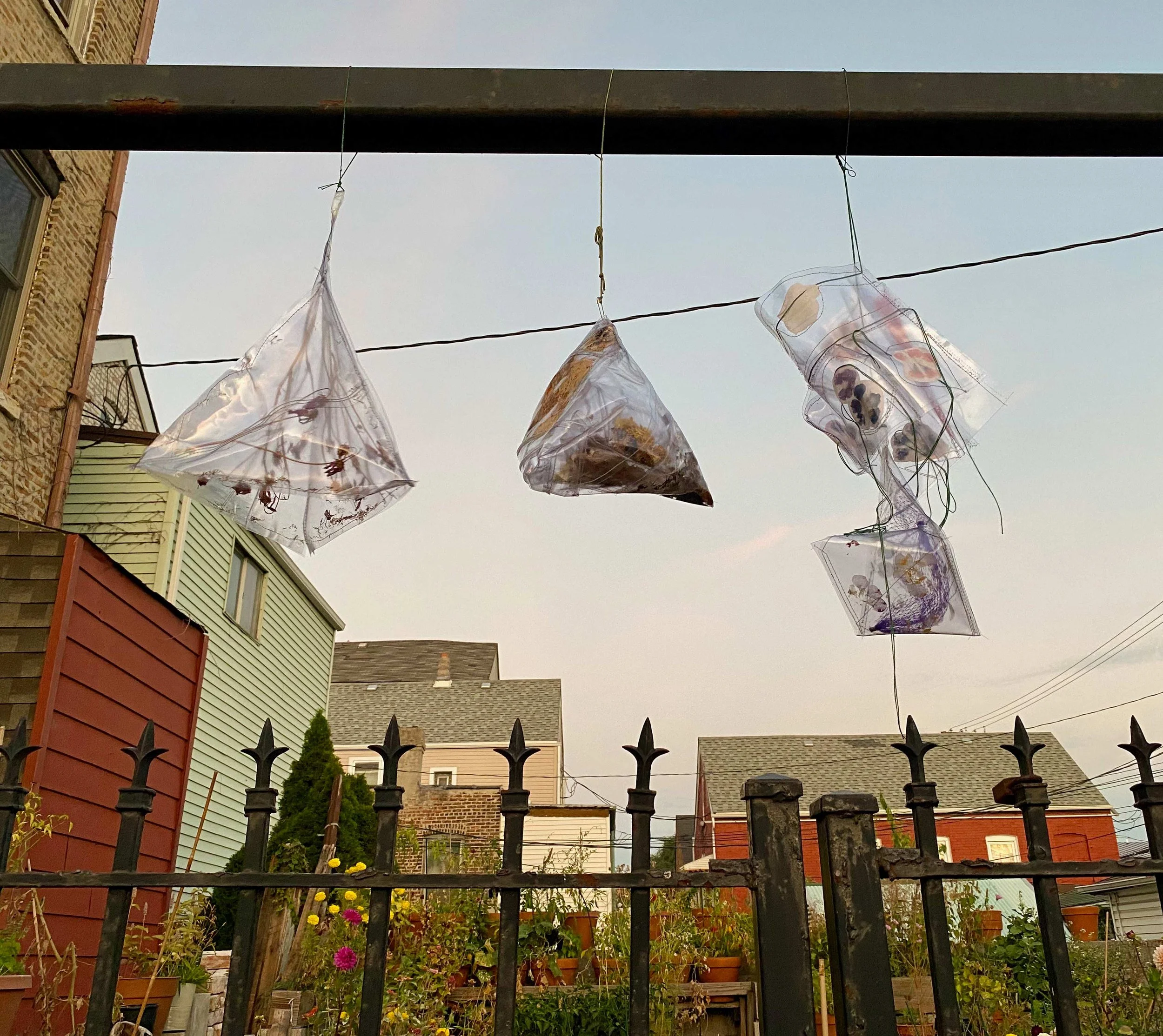 Sculptures made of clear vinyl, containing flower stamped fabric, pounded petals, and flower skeletons. These sculptures preserve the fleeting beauty of my summer garden. Instead of making bouquets, I pound flowers into fabric, preserving their image, turning them into ghosts. There has been periodic percussive hammering in my alley, and it was me pounding layers of fabric and flowers on concrete. I use the fabric, refuse, and stalks to make these sculptures. I hope you look at them from every angle. Imagine the dreams you can’t let go of, good and bad, trapped in the transparent vinyl, like ghosts.