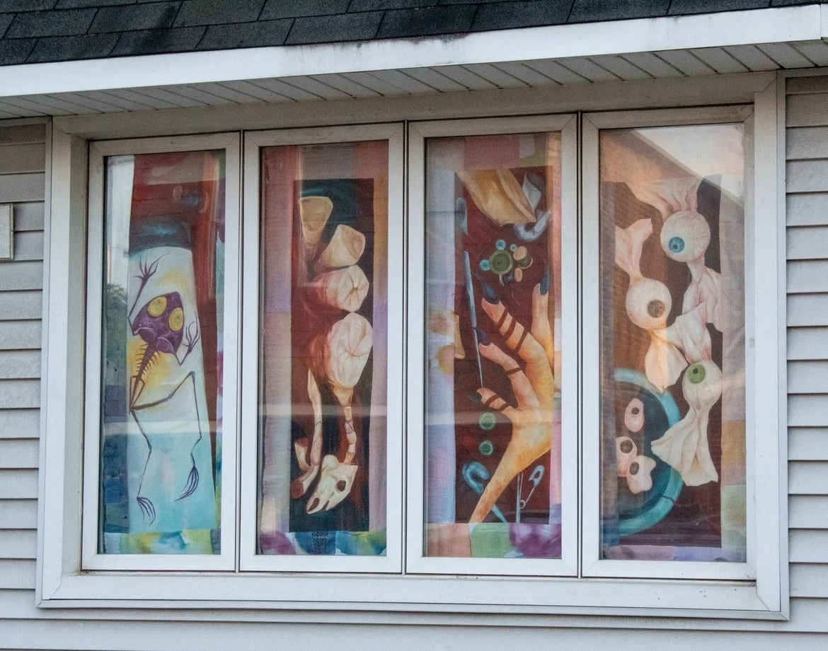 Faux stained glass shines, lit from the buliding light within. Painted mylar plastic photo gels and tail lights pieced together. Hosted by Point Blank Gallery @ 3317 W Fullerton Ave.