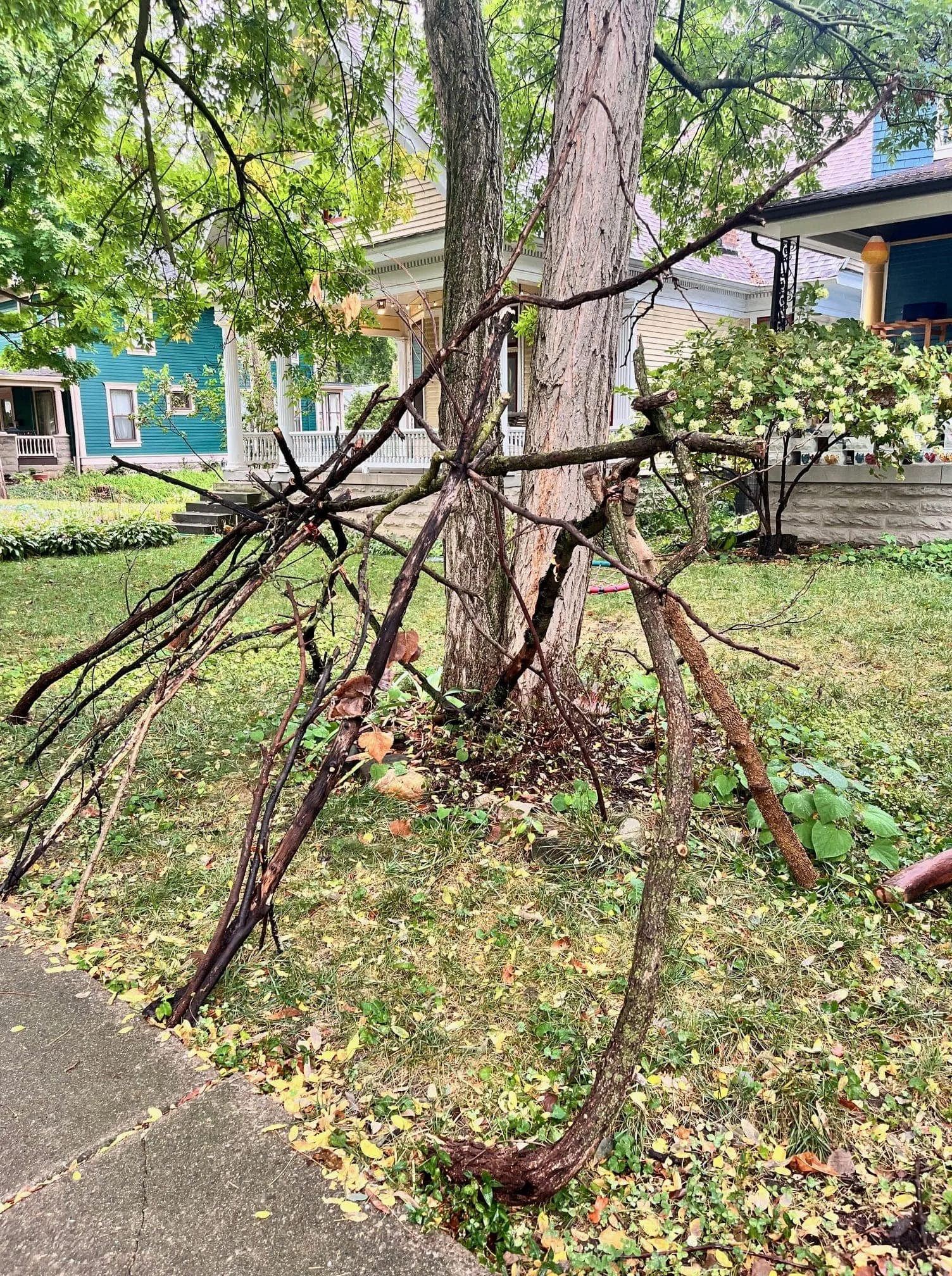 Artist, Alex Hughes, invites your inner child to join the homebuilding alongside other industrious creatures of Indianapolis —repeat a form from nature in her front yard. When I see our stick-pile, typically utilized for firewood, I see forms of the praying mantis, I see rib cages, chandeliers, I see dancing bones and doorways. I invite neighbors to use the dead and down wood found this fall to build nests, walkways, acorn-soups, leaf-blankets, and arches like mine in this yard. Take notes from nature, like squirrels wintering with scraps of unwanted debris, nesting imperfectly, but securely into our urban tree-top canopy.