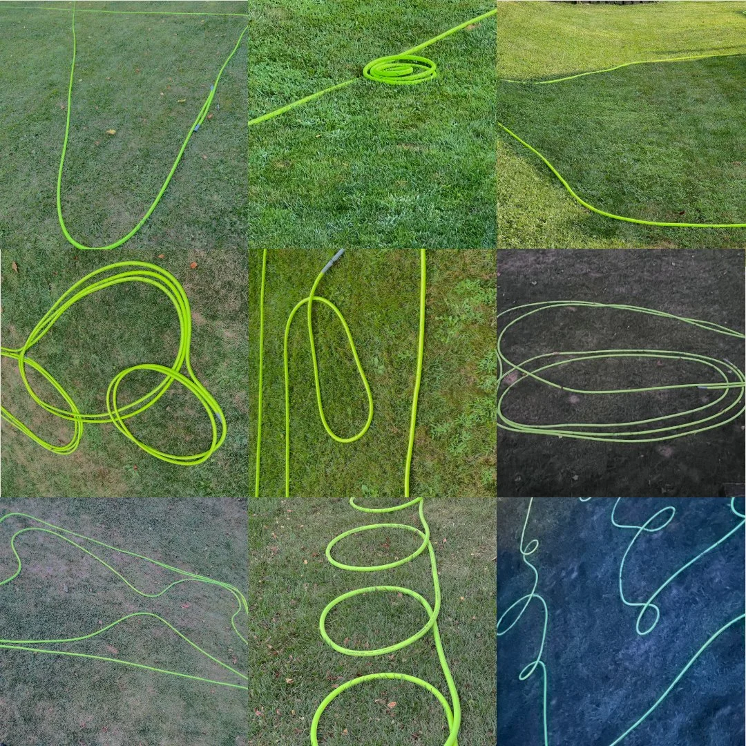 The garden hose, an object often left to trace casual and shifting lines across lawns, is used as a prompt for ephemeral, site-specific drawings. These hose formations reflect a quiet choreography of domestic maintenance, offering a meditation on how mundane gestures inscribe visual abstractions into the landscape. Amid the rhythms of everyday, these shifting abstractions give way to moments of visual and spatial solace.