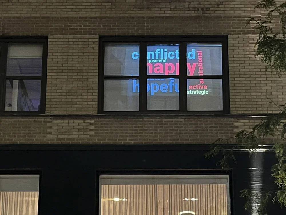 American Sentiment X by Jeff Phillips is on view at 55 East Ontario Street for the 2025 Terrain Biennial. American X is a data-driven public projection that reveals the emotional pulse of the nation in real time.